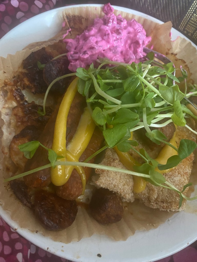 Vegobullar, vegokorv, gratinerad tofu, variant på Jansson men med kapris. Starkt senap och ärtskott. Det finns tofusill i kylen men det får bli nattamat.