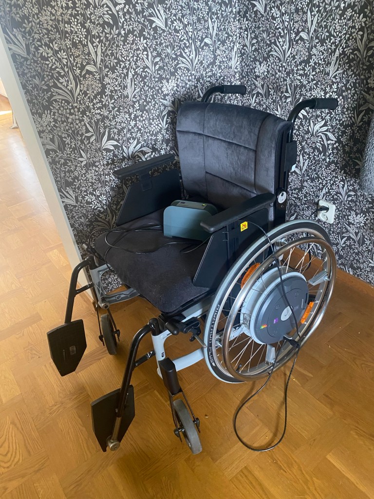 Jag har fått en rullstol med drivmotor i hjulen. Den är så lätt styrd att det räcker med att man petar på den. Jag får öva massor här hemma.
